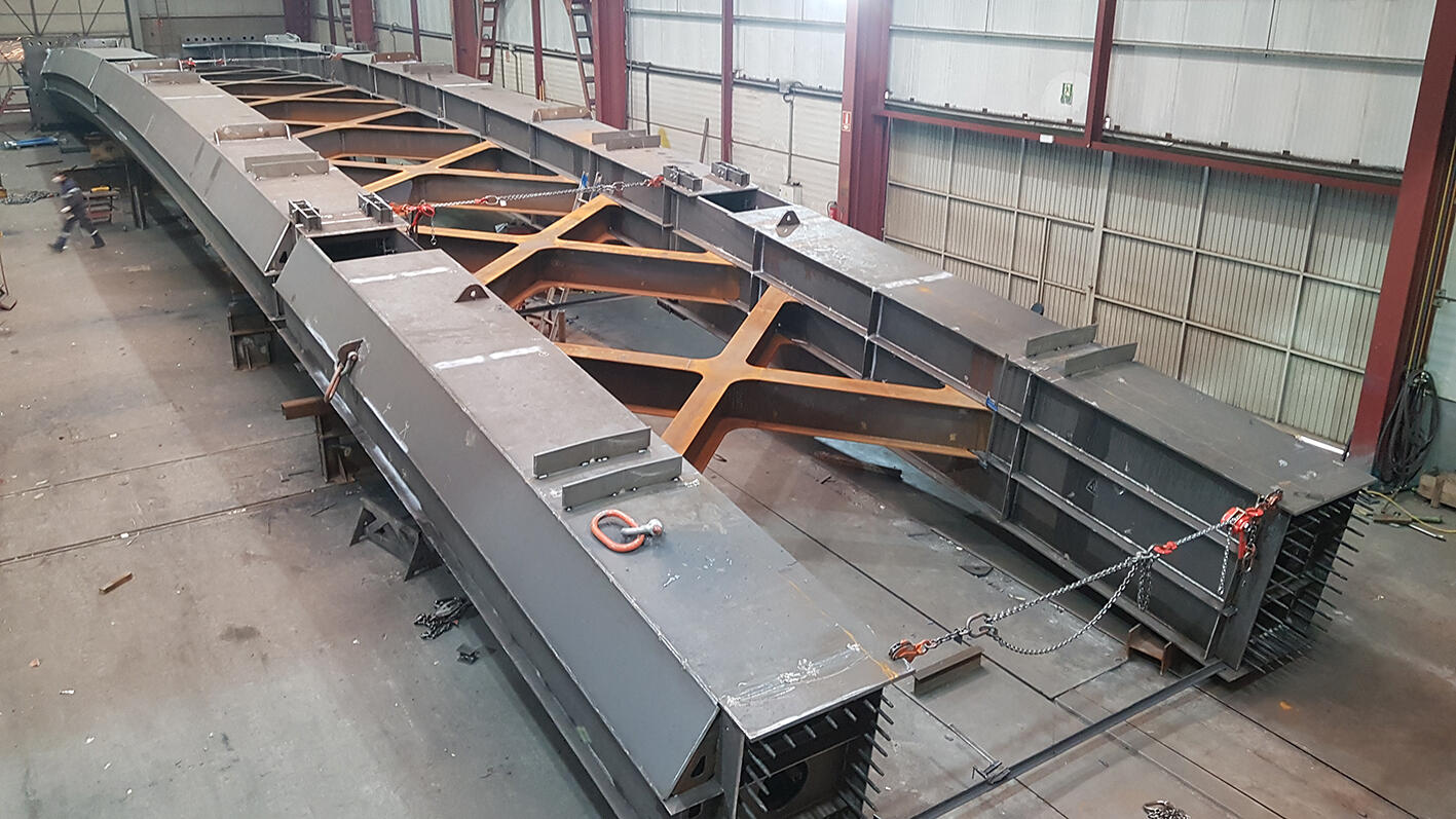 The composite section arches, with a metal box filled with concrete, have a variable depth between 2.20 m and 1.50 m. The transverse bracing between each pair of arches, spaced 5,40 m apart, is carried out by means of diagonals 0.3 m wide and 15 mm thick.