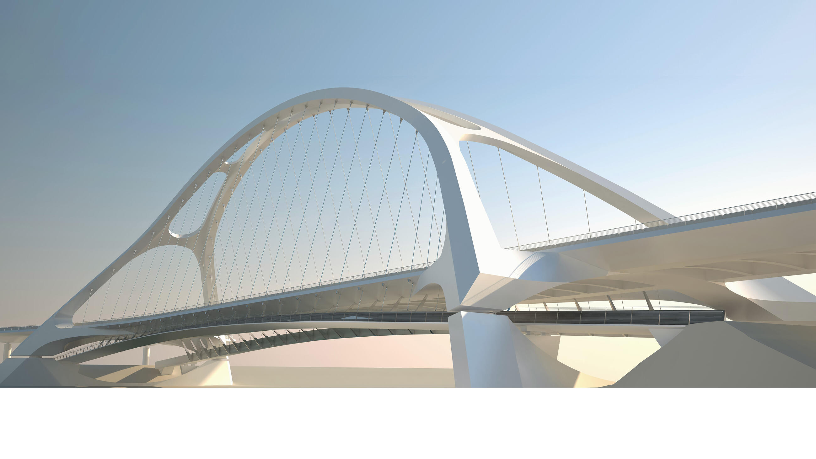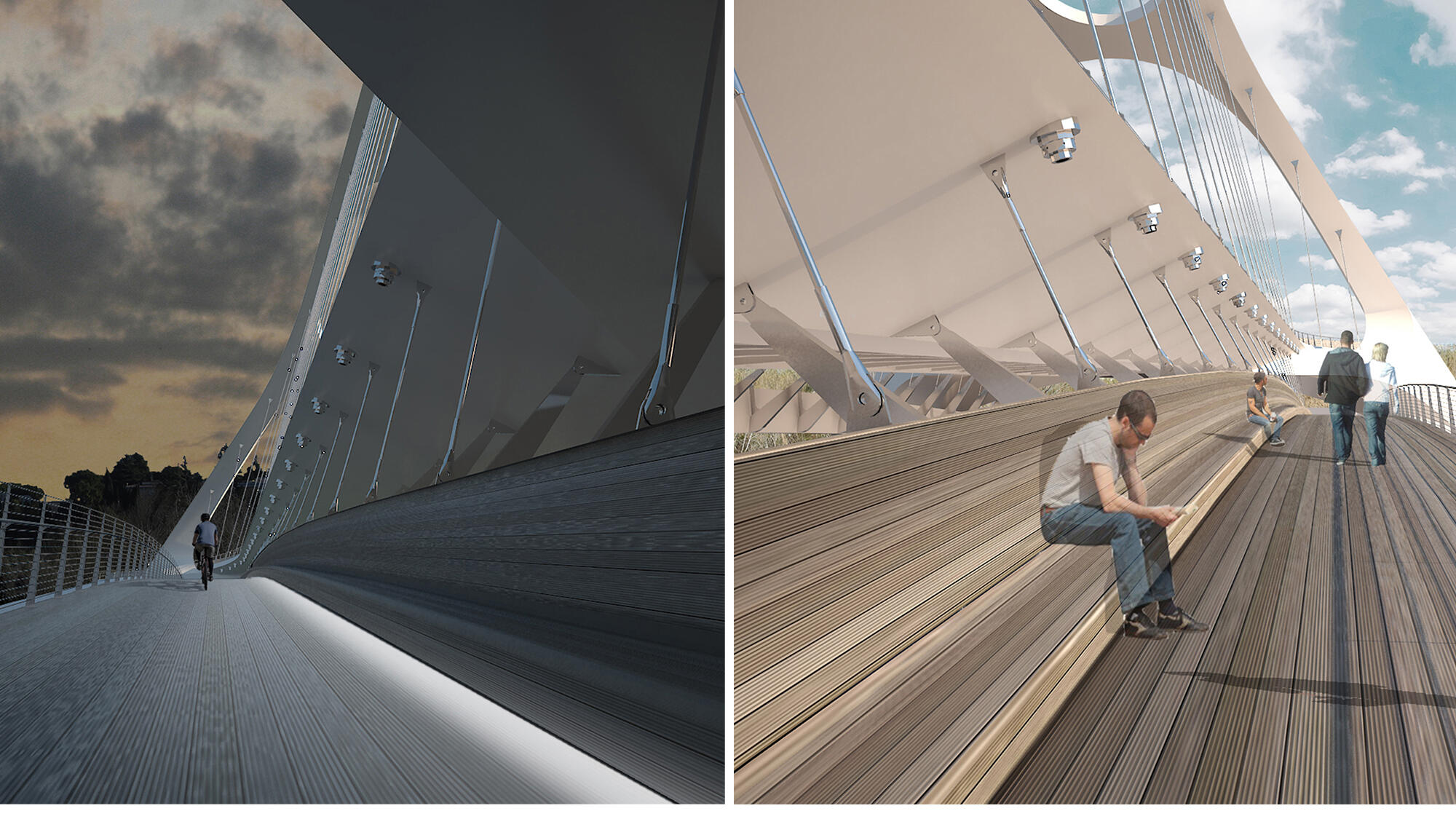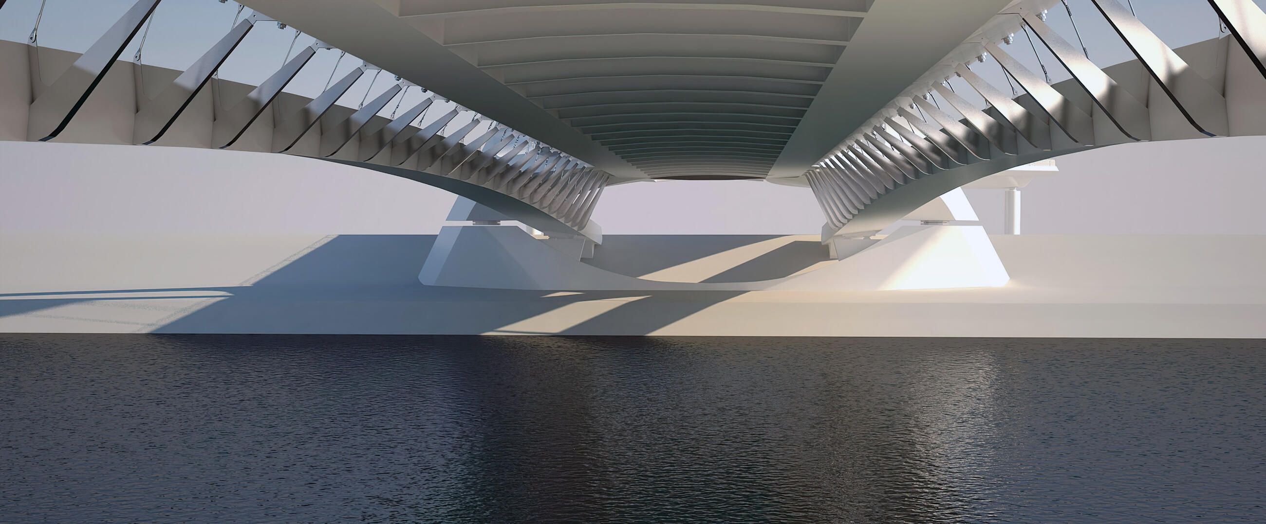 The two steel arches fly over the deck with a spatial configuration and transversal bracing integrated in the architectural design. Full locked cable hangers allow suspending the deck from the arch. Another special feature is the variable width of the deck that divides in two at one end, conditioning the geometry of the arch that opens transversally in their connection with the deck.