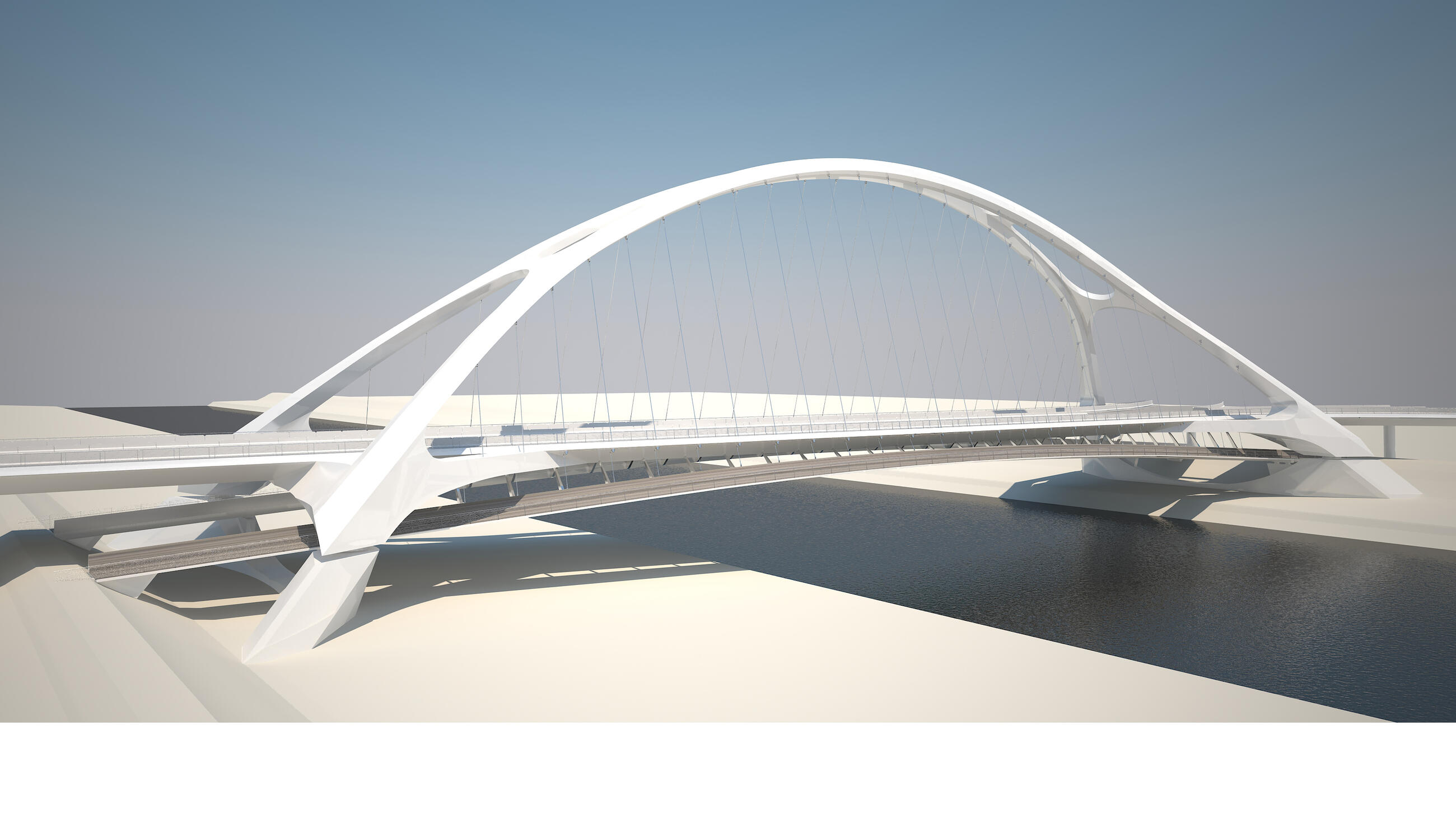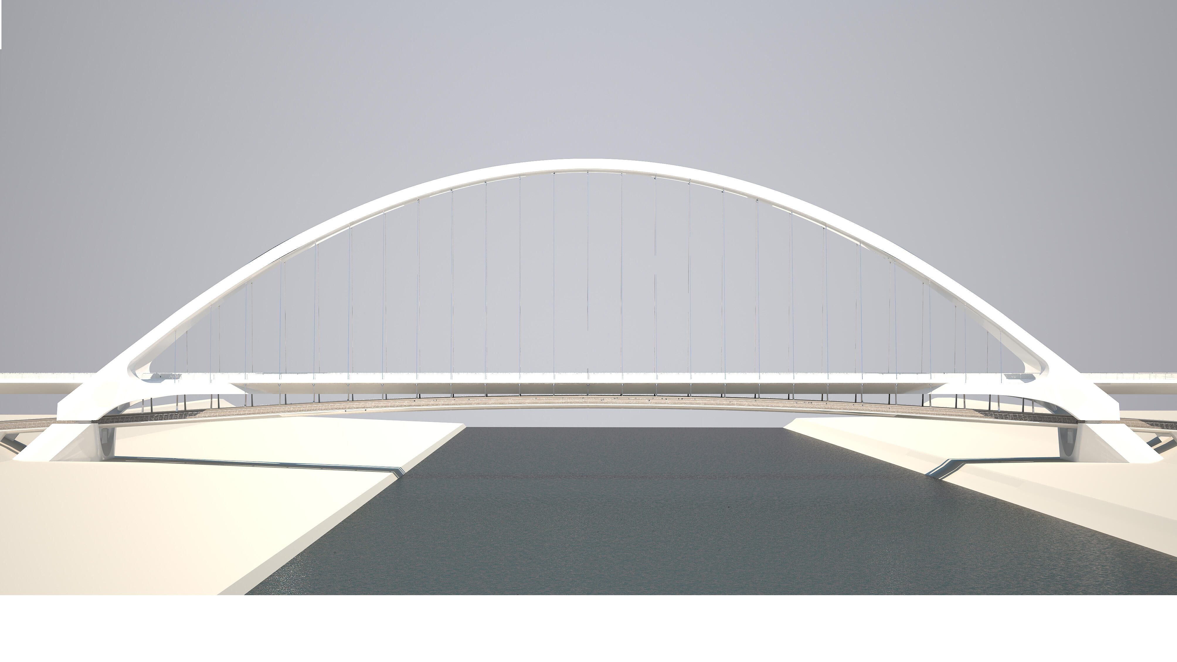 The new design is a steel bowstring arch bridge with 174 m main span, and it holds a 25 m wide deck, and two side footbridges that are suspended from the deck at a different level, allowing to link the new footpaths and bicycle paths at both river banks.