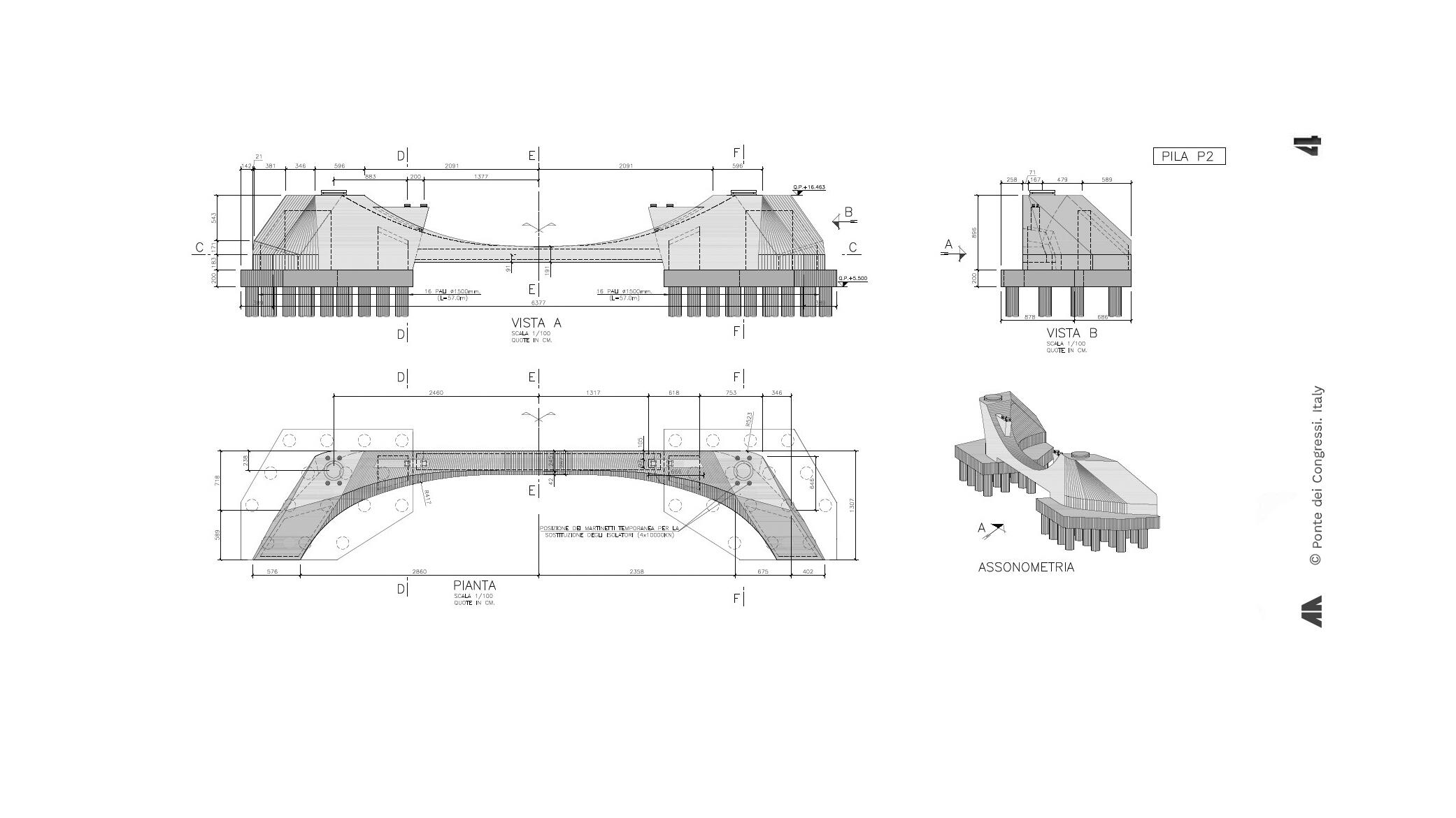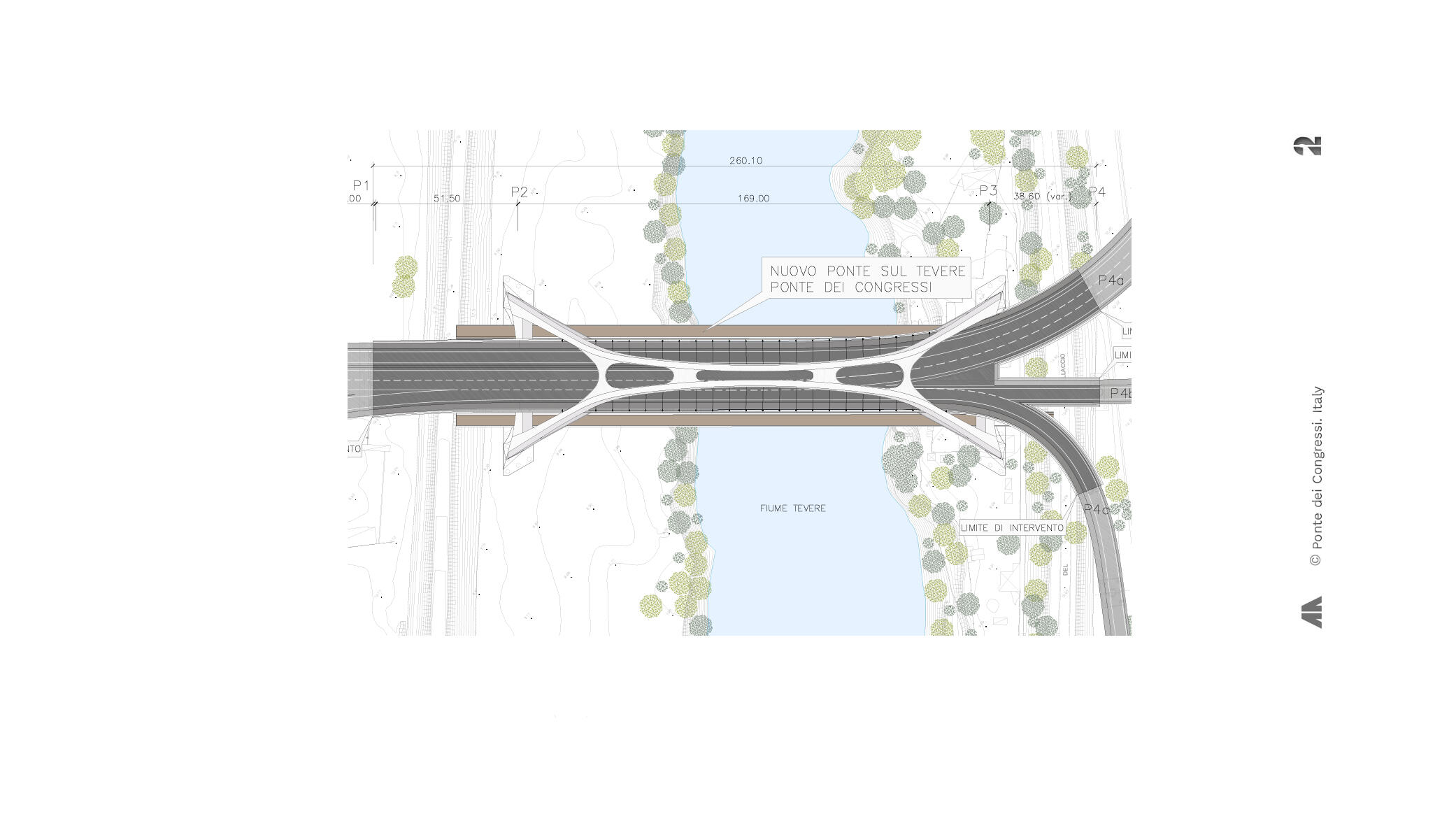The Ponte dei Congressi is a new bridge designed for the city of Rome over the Tiber River. This design is developed by the professional association of engineers and architects who won the international design competition for this bridge in the year 2001. The design has been adapted a renewed according to the new conditions of the road and traffic design planned in the area.
