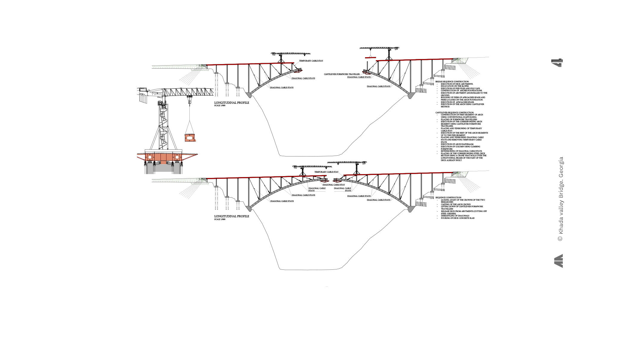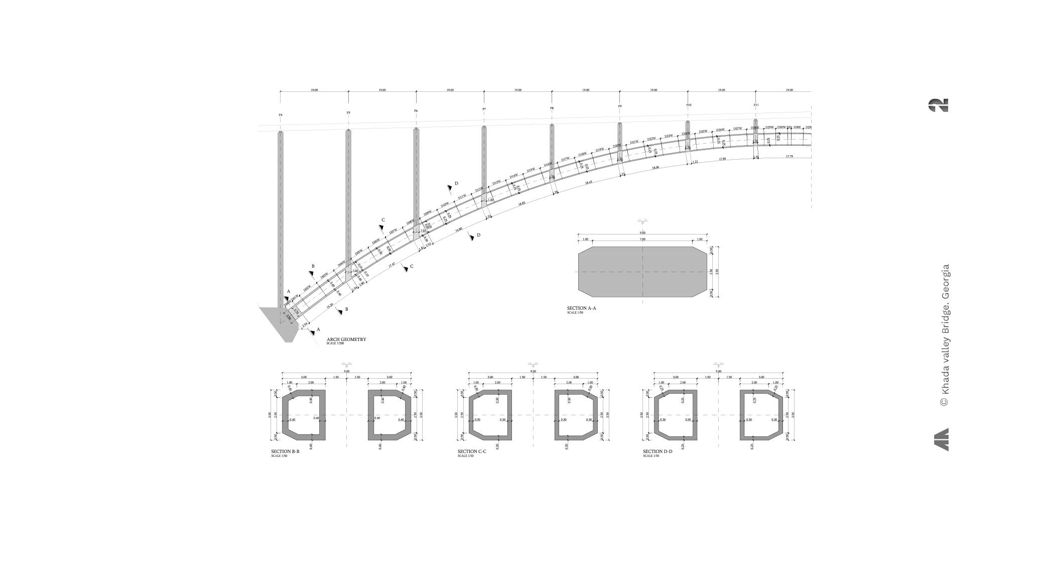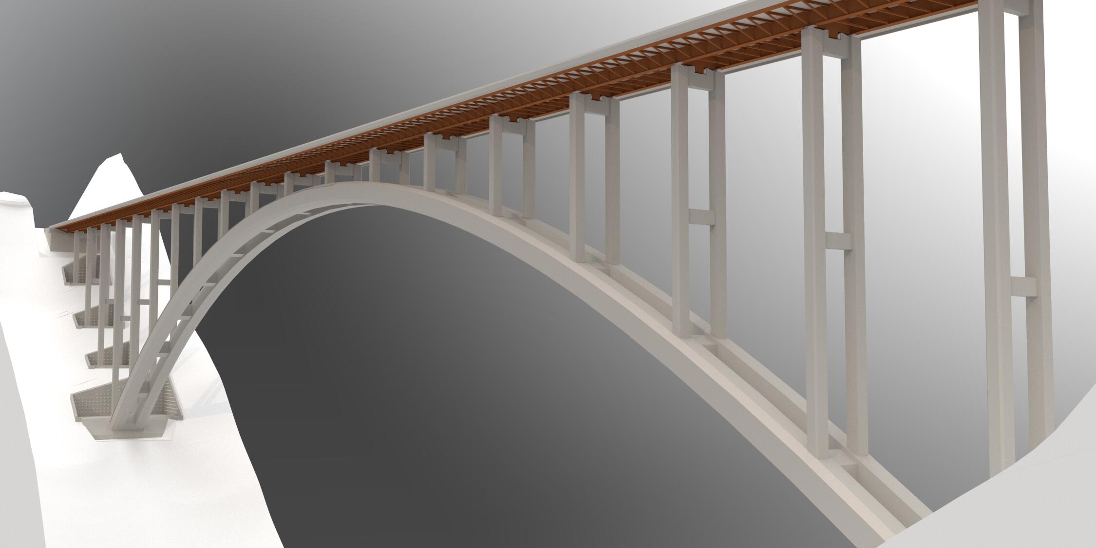 The arch has been designed with a main span of 285.00 m. The arch rises up to 51.50 m. The deck is supported on a set of pillars and spandrel columns spaced 19.00 m, being the span length the same both in the approach viaducts and over the main arch. This span arrangement intends, first to set out enough supports over the arch in order to guarantee its good antifunicular behaviour with a curved (not polygonal) geometry and, second, to allow the use of a cantilever construction method with temporary diagonals.