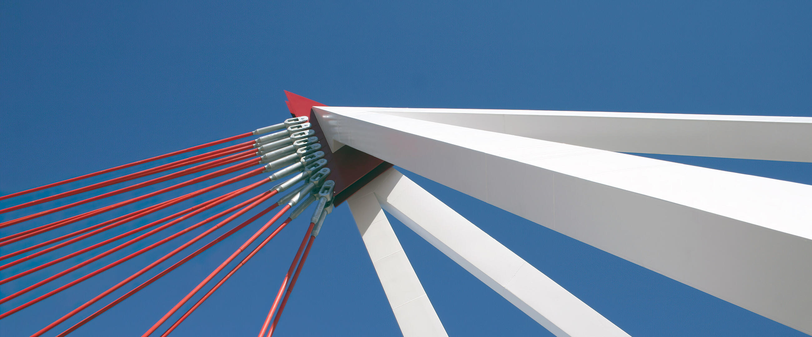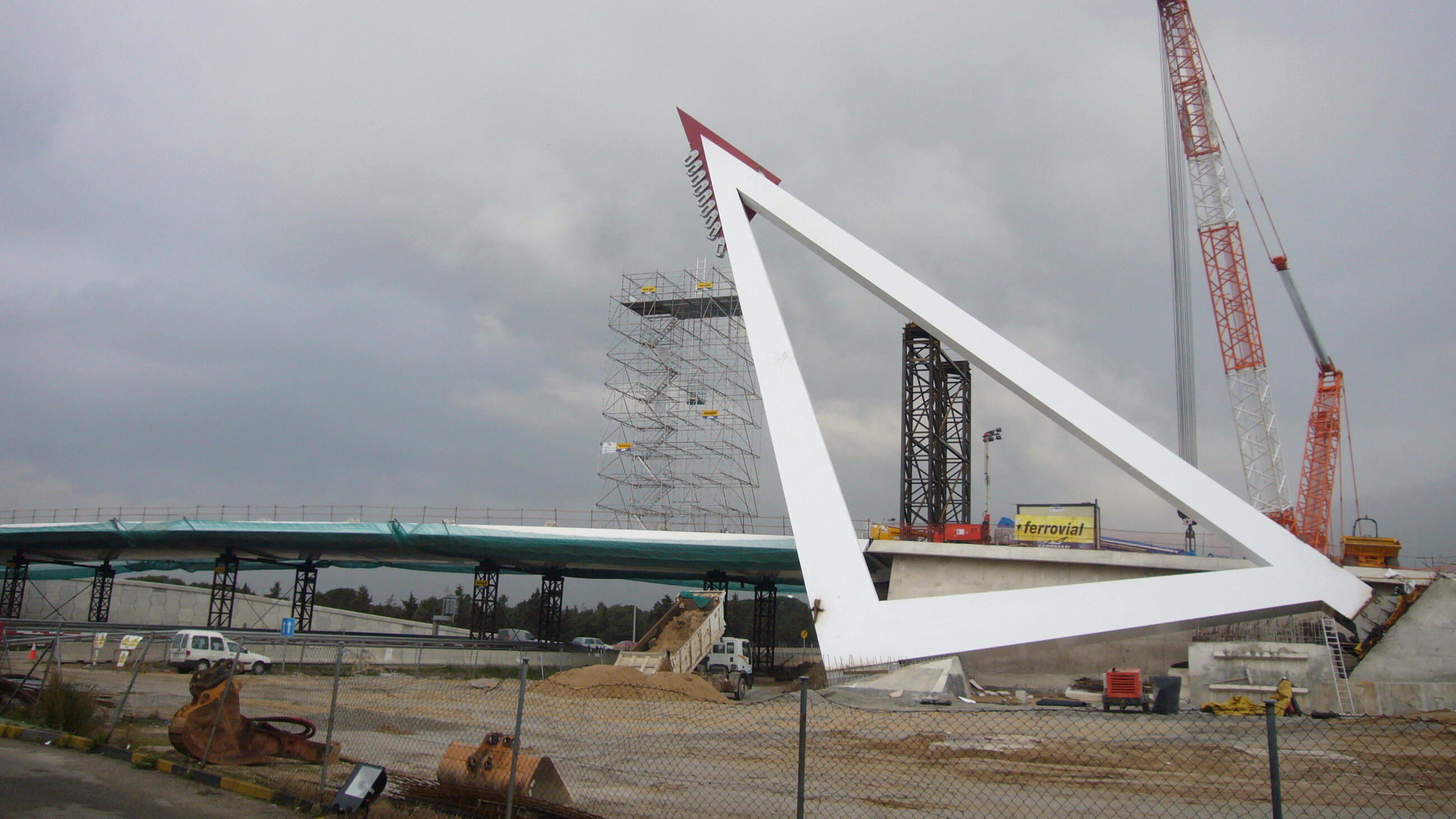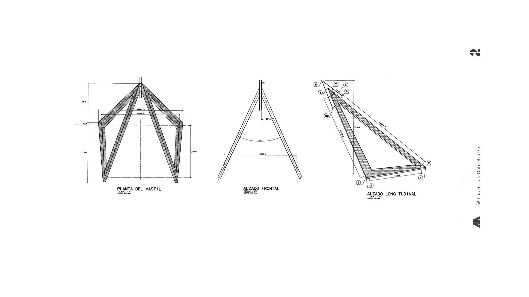 This asymmetrical bridge is configured with a 45 meters height, 39 of them over the deck, and with a central suspension plane composed by 9 pairs of stays, which are anchored on the top of the mast to a triangular red element for transmitting the forces to the frame-mast, materialized by two inclined white “set-squares” linked in its top vertex.