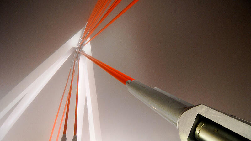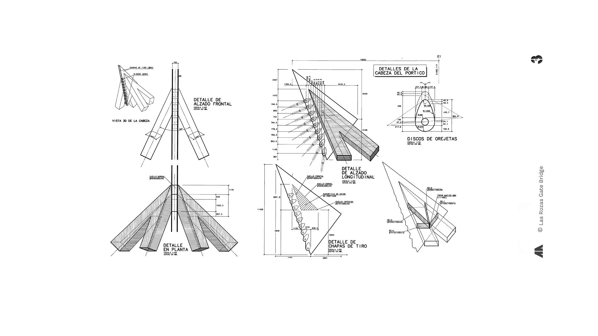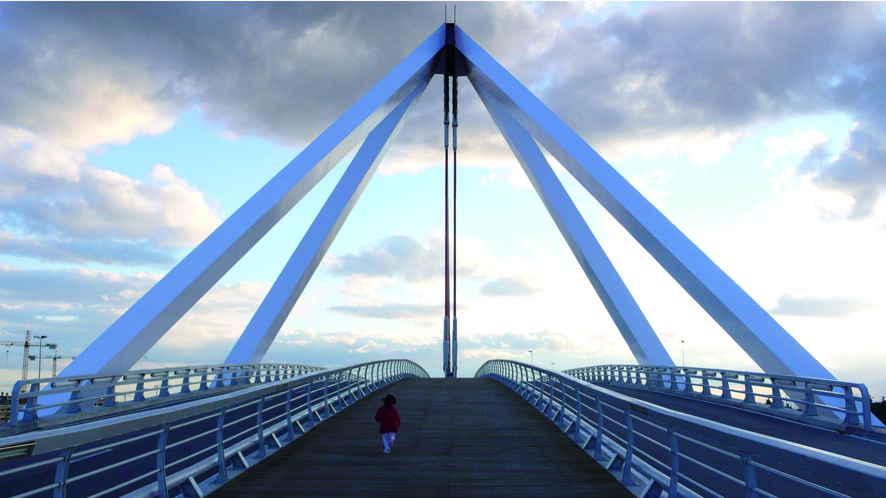 This asymmetrical bridge is configured with a 45 meters height, 39 of them over the deck, and with a central suspension plane composed by 9 pairs of stays, which are anchored on the top of the mast to a triangular red element for transmitting the forces to the frame-mast, materialized by two inclined white “set-squares” linked in its top vertex.